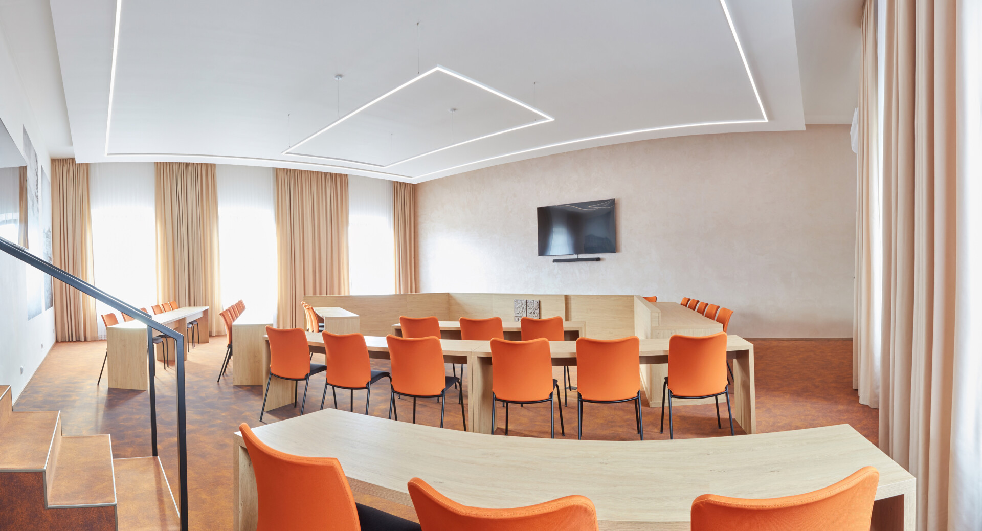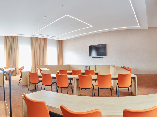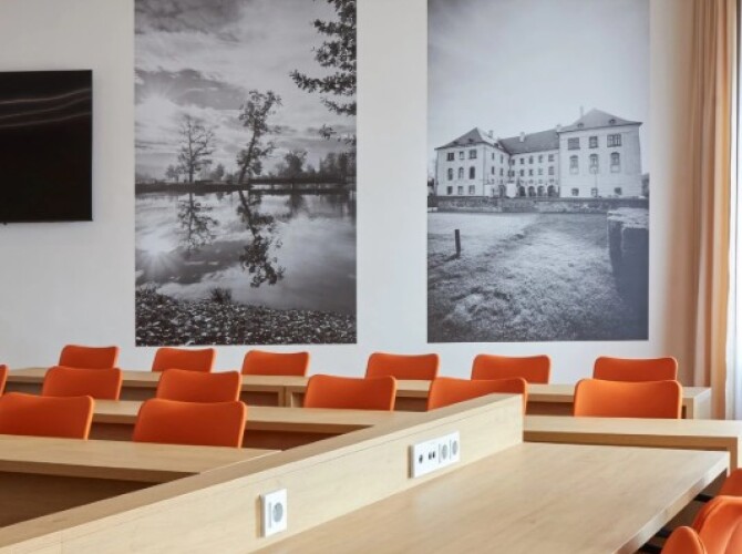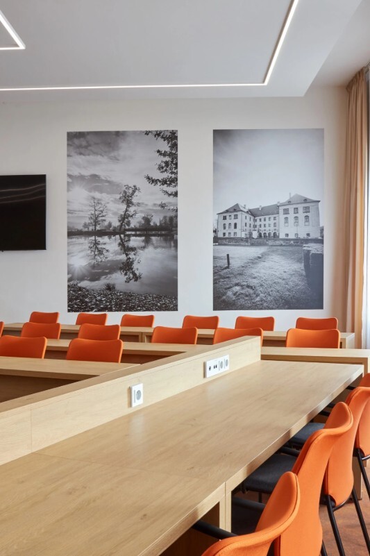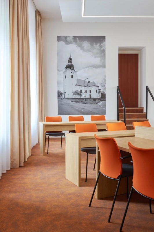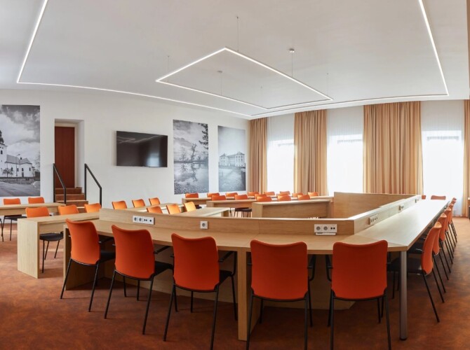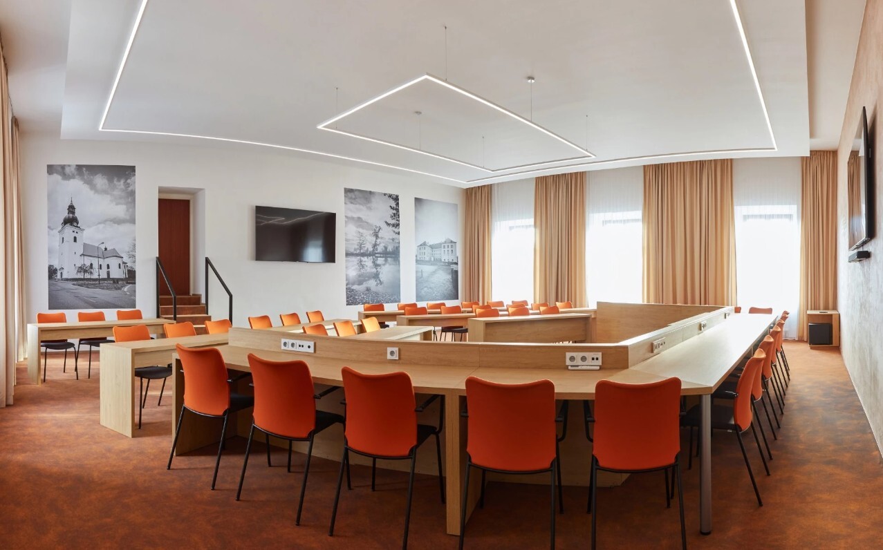 Realizace zasedacích místností v Kunštátě proběhla dle návrhu architektky. Pro vybavení prostoru jsme použili jednací židle SUN, celočalouněné, ve variantách s područkami i bez područek, které zajišťují jednotný vzhled a komfort při jednáních. Realizace 2023.