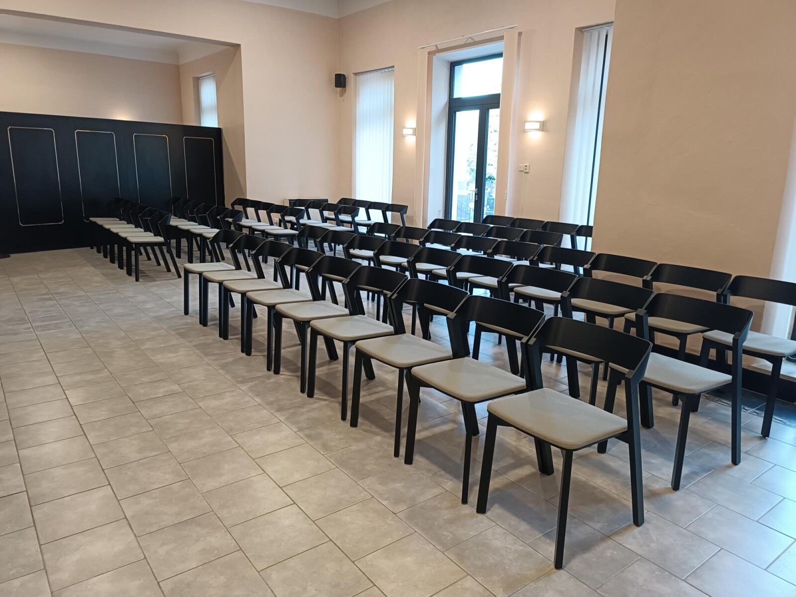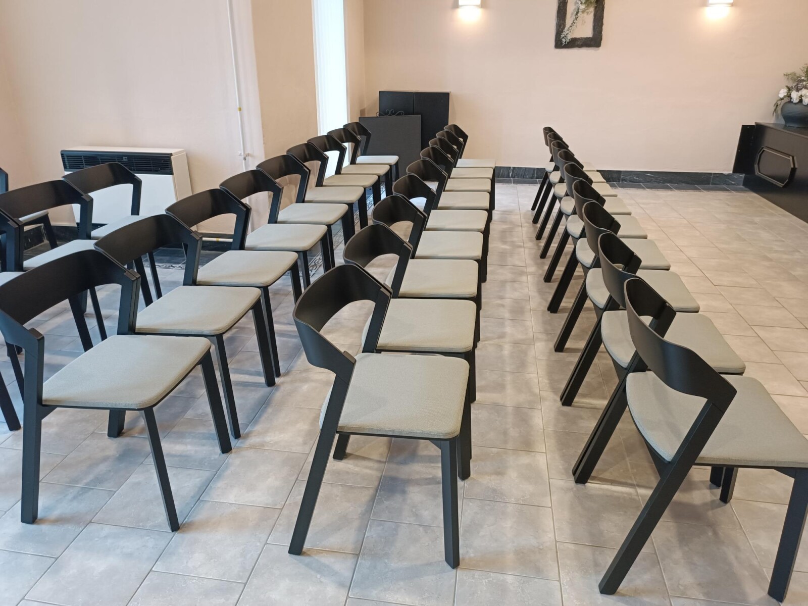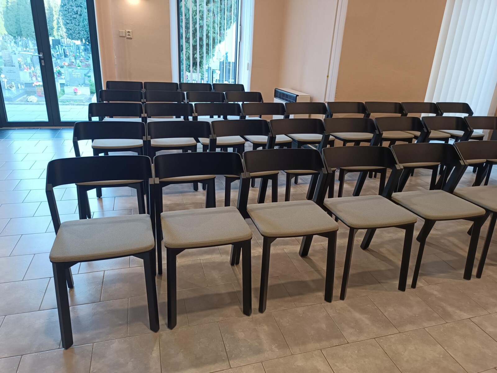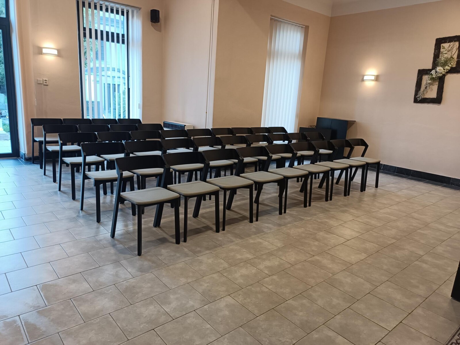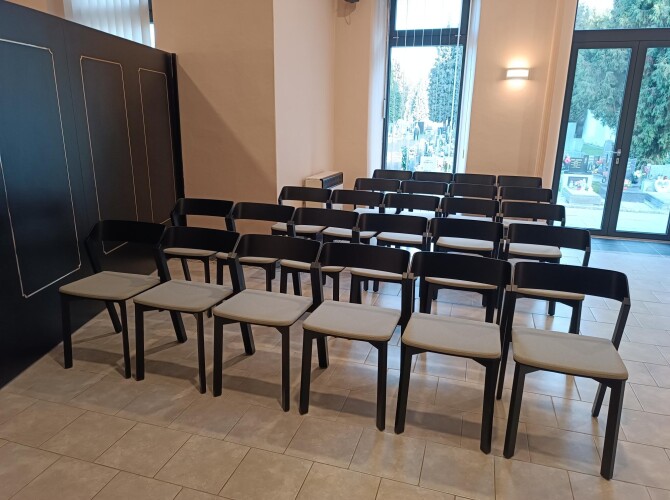 Do smuteční síně v Krnově jsme dodávali dřevěné židle TON Merano s čalouněným sedákem. Tento model byl vybrán architektem města.