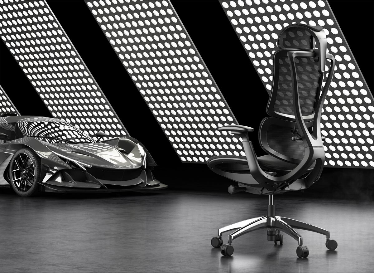 Designová kancelářská židle se síťovinou na sedáku, opěráku i hlavové opěrce.