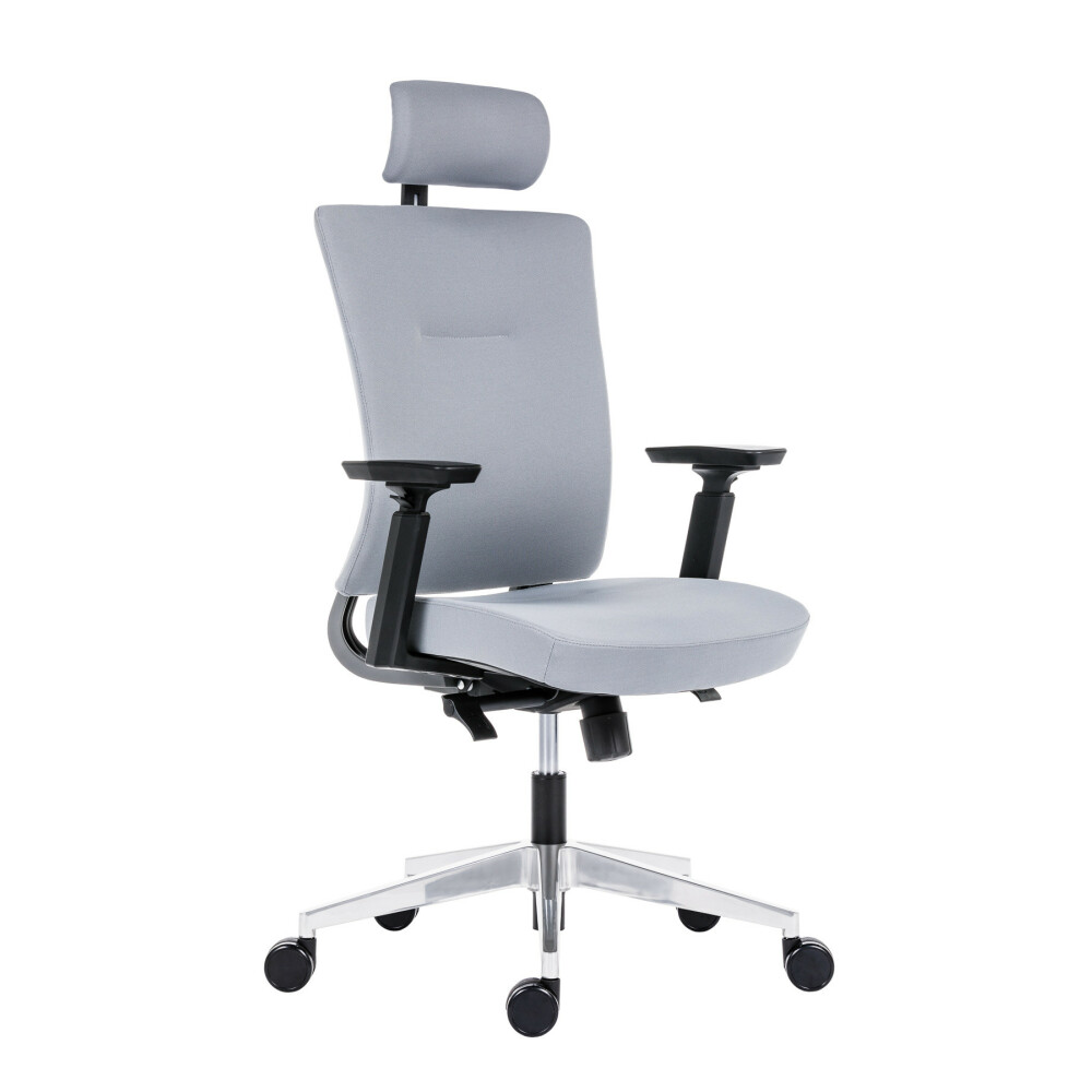 Moderní kancelářská židle Next splňuje veškeré požadavky pro plnohodnotné sezení. Židle má celočalouněný sedák a opěrák, opěrák je doplněn o podhlavník. V sedáku je použita studená pěna vstřikovaná do formy. Kancelářská židle má synchronní mechanismus s trojnásobnou aretací s možností plynulé proměny úhlu sedáku a opěráku. Nastavení tuhosti mechanismu podle tělesné hmotnosti uživatele. Hlavová opěrka je výškově a úhlově nastavitelná. Kříž je leštěný hliník. Kolečka o průměru 65 mm s nízkým valivým odporem. Područky jsou výškově, úhlově a podélně nastavitelné s měkkou dotykovou plochou. Sezení oceníte jak na pracovišti, tak jako domácí kancelářskou židli. Nosnost židli je 130 kg.