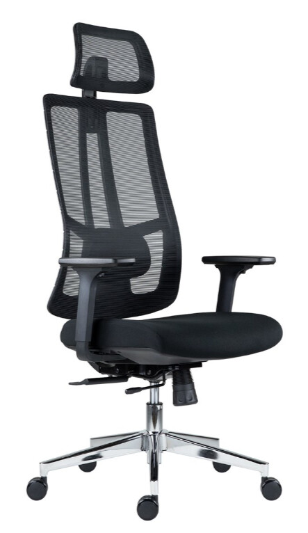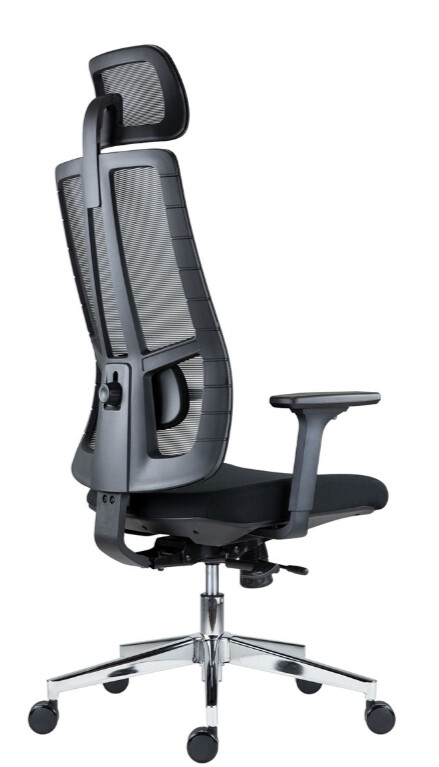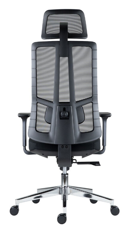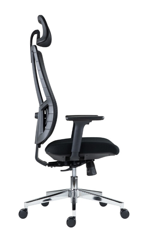 Synchronní mechanismus s čtyřnásobnou aretací, nastavením síly protiváhy a hloubkovým posunem sedáku (0-50 mm, 6 poloh) zajišťuje dynamické sezení. Výškově nastavitelné područky s měkkou dotykovou plochou lze regulovat podélně a úhlově. Černý potah sedáku, chromovaná ocelová báze Ø 700 mm, plynový píst třídy CLASS 4 a univerzální kolečka Ø 60 mm. Nosnost 150 kg, záruka 36 měsíců, český výrobek.