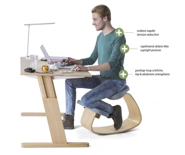 Klekačka je díky vhodně zakřiveným plochám korpusu stabilní, reaguje však na změnu polohy sezení z aktivního do uvolněného držení těla mírným výkyvem. Tyto změny polohy korpusu při různých pozicích sezení zajišťují vždy přirozené, ergonomické držení těla, které je preventivní proti napětí za krkem, v rameni a zádech. Velmi pozitivní zejména pro bederní páteř je správné naklonění pánve při sezení s oporou kolen.