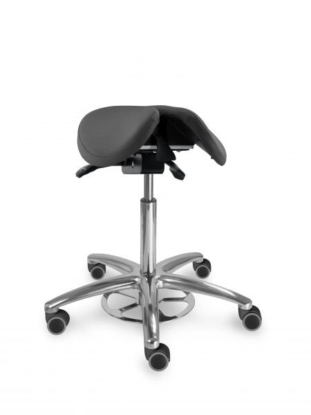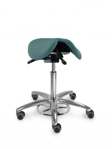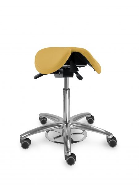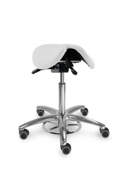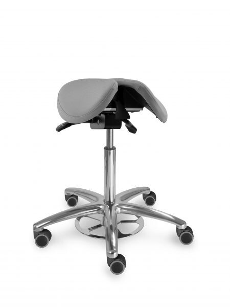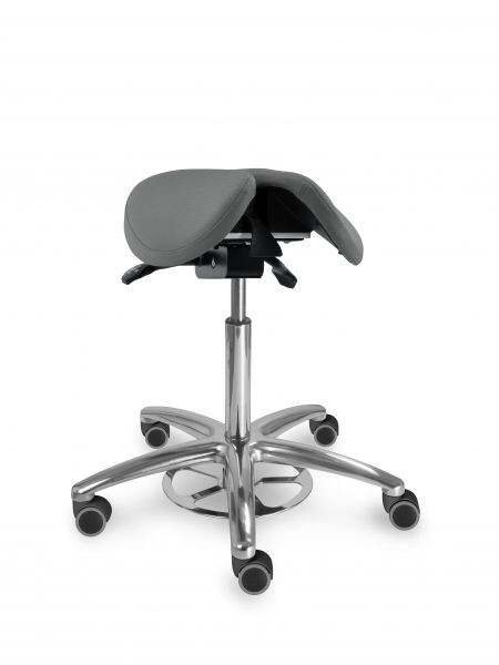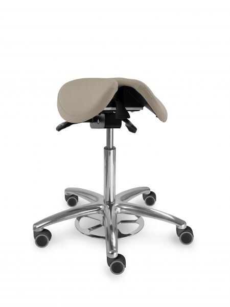 Vysoká otočná stolička s naklápěcím děleným sedlovým sedákem je výškově stavitelná. Židle má má kruh na nohy, který slouží k pohodlnému opření nohou. Kříž je leštěný hliníkový pětiramenný o průměru 66 cm a vysoký chromovaný píst bez krytu pístu, výška sedáku je 59-79 cm. Stolička zajišťuje ergonomické stabilní sezení s možností náklonu sedáku až o 18 stupňů. Mechanika je ocelová barva černá, aretace nastavení výšky sezení pomocí páčky, aretace nastavení sklonu sezení dopředu (0 - 11 stupňů) nebo vzad (0 - 7 stupňů) pomocí páčky. Sedák je čalouněný koženkou nebo potahovou látkou, barvu čalounění sedáku lze zvolit. Plastové díly jsou světle šedé RAL 7035. Dle potřeby lze zvolit kolečka nebo kluzáky. Kolečka u židle jsou s bezpečnostní brzdou. Stolička je vhodná do zdravotnictví, či do různých veřejných prostor nebo do domácnosti. Do zdravotnictví doporučujeme koženku - snadná údržba.