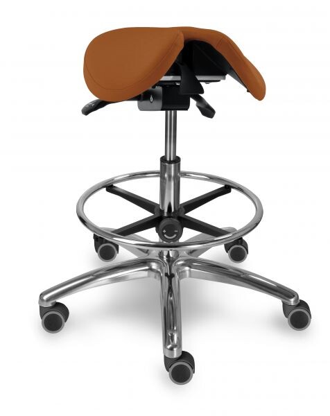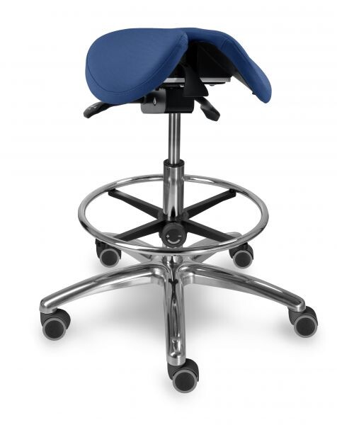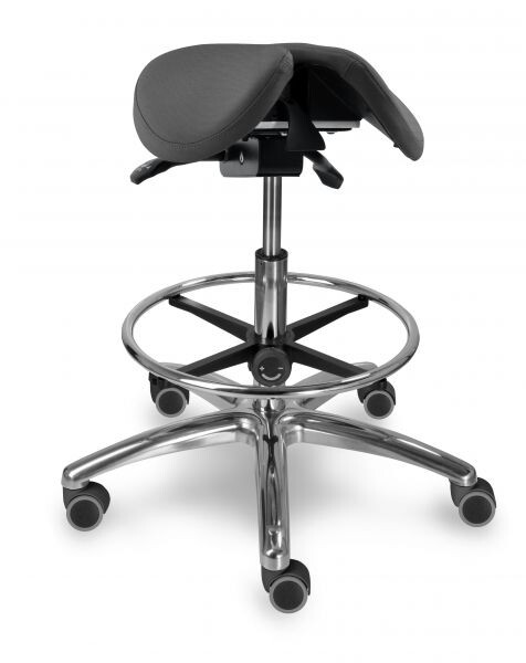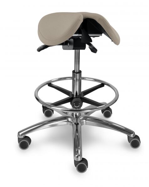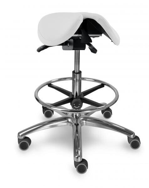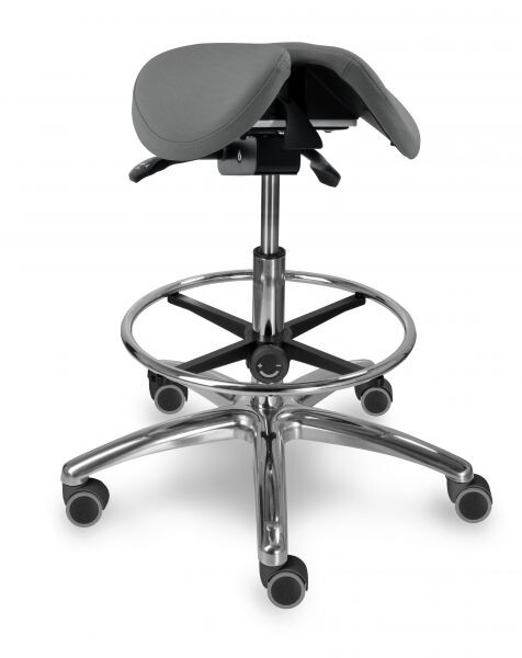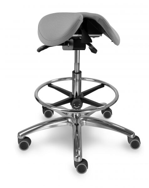 Vysoká otočná stolička s naklápěcím děleným sedlovým sedákem je výškově stavitelná. Židle má má kruh na nohy, který slouží k pohodlnému opření nohou. Kříž je leštěný hliníkový pětiramenný o průměru 66 cm a vysoký chromovaný píst bez krytu pístu, výška sedáku je 59-79 cm. Stolička zajišťuje ergonomické stabilní sezení s možností náklonu sedáku až o 18 stupňů. Mechanika je ocelová barva černá, aretace nastavení výšky sezení pomocí páčky, aretace nastavení sklonu sezení dopředu (0 - 11 stupňů) nebo vzad (0 - 7 stupňů) pomocí páčky. Sedák je čalouněný koženkou nebo potahovou látkou, barvu čalounění sedáku lze zvolit. Plastové díly jsou světle šedé RAL 7035. Dle potřeby lze zvolit kolečka nebo kluzáky. Kolečka u židle jsou s bezpečnostní brzdou. Stolička je vhodná do zdravotnictví, či do různých veřejných prostor nebo do domácnosti. Do zdravotnictví doporučujeme koženku - snadná údržba.