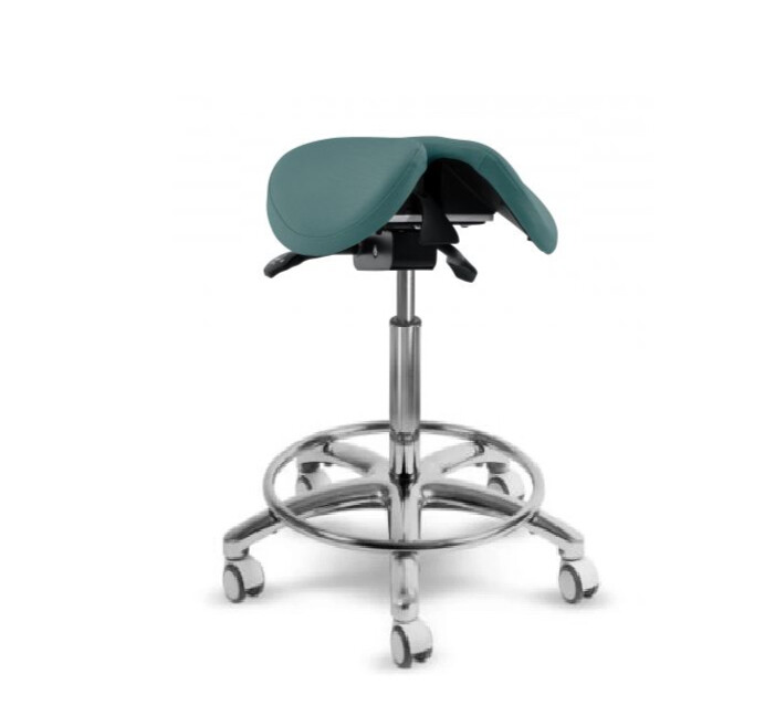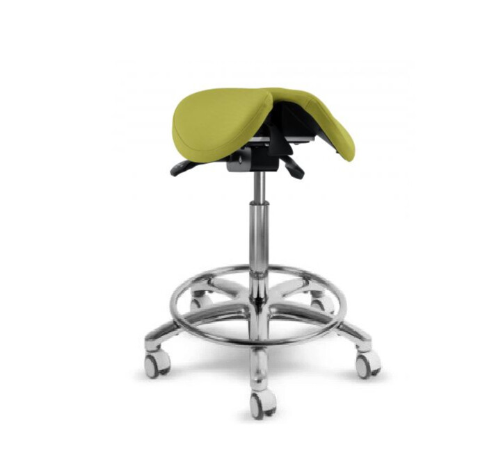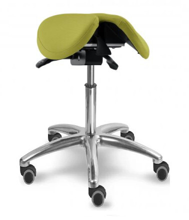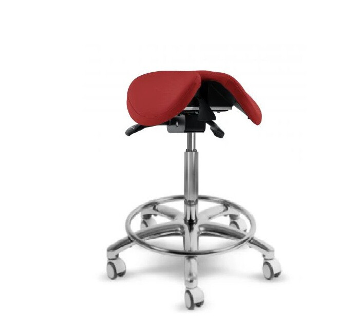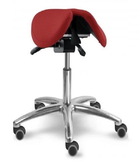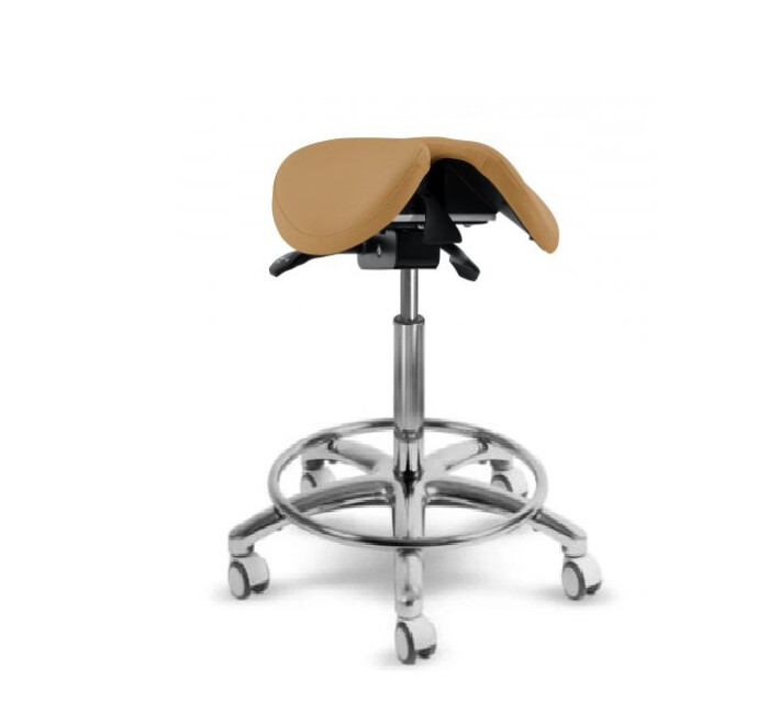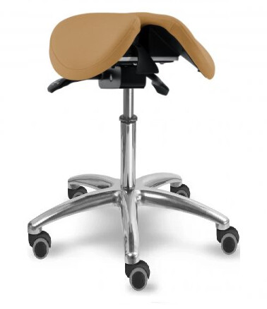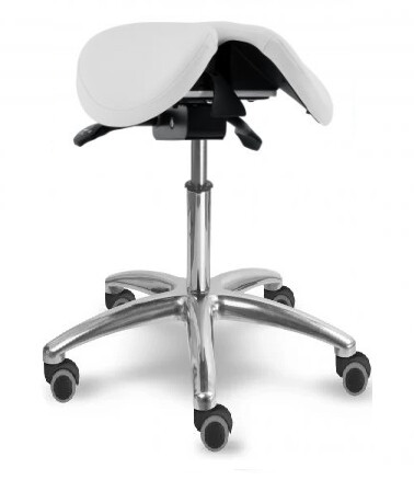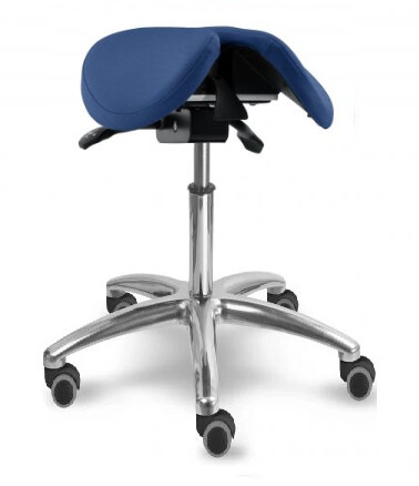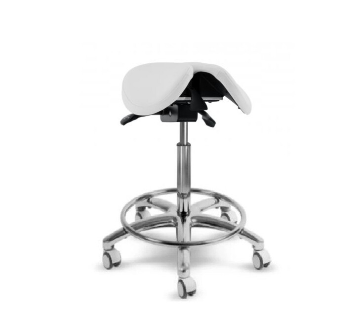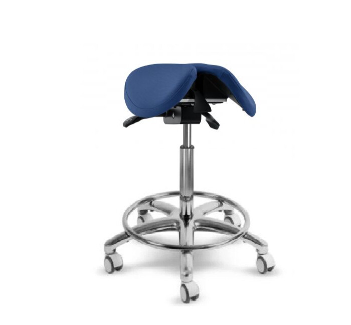 Vysoká otočná stolička s naklápěcím děleným sedlovým sedákem je výškově stavitelná. Židle má leštěný, hliníkový pětiramenný kříž o průměru 66 cm a vysoký chromovaný píst bez krytu pístu, výška sedáku je 59-79 cm. Stolička zajišťuje ergonomické stabilní sezení s možností náklonu sedáku až o 18 stupňů. Mechanika je ocelová barva černá, aretace nastavení výšky sezení pomocí páčky, aretace nastavení sklonu sezení dopředu (0 - 11 stupňů) nebo vzad (0 - 7 stupňů) pomocí páčky. Sedák je čalouněný koženkou nebo potahovou látkou, barvu čalounění sedáku lze zvolit. Plastové díly jsou světle šedé RAL 7035. Dle potřeby lze zvolit kolečka nebo kluzáky. Kolečka u židle jsou s bezpečnostní brzdou. Stolička je vhodná do zdravotnictví, či do různých veřejných prostor nebo do domácnosti. Do zdravotnictví doporučujeme koženku - snadná údržba.
