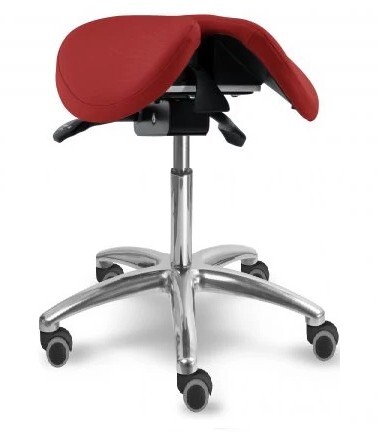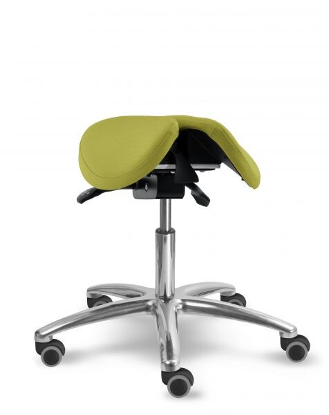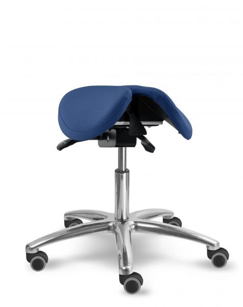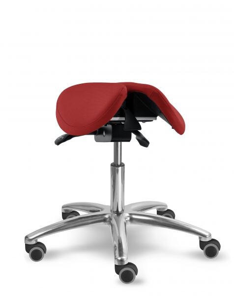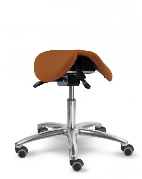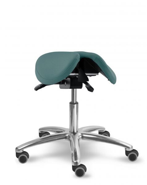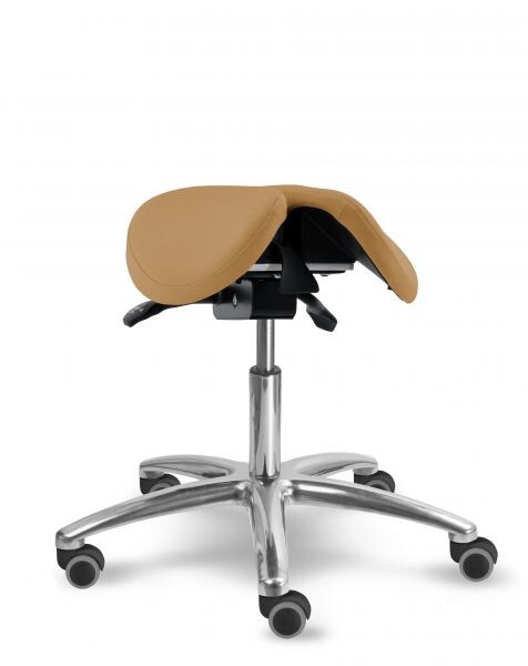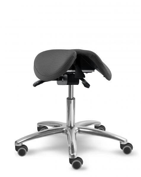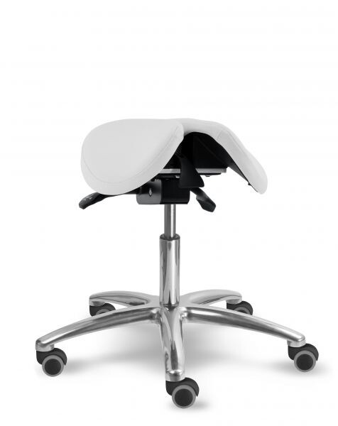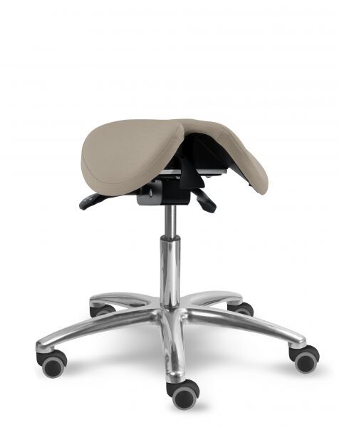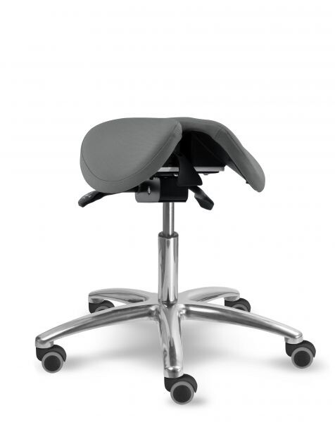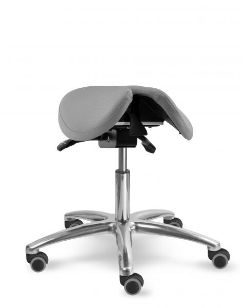Otočná stolička s naklápěcím děleným sedlovým sedákem je výškově stavitelná. Židle má leštěný, hliníkový pětiramenný kříž o průměru 66 cm. Stolička zajišťuje ergonomické stabilní sezení s možností náklonu sedáku až o 18 stupňů. Mechanika je ocelová barva černá, aretace nastavení výšky sezení pomocí páčky, aretace nastavení sklonu sezení dopředu (0 - 11 stupňů) nebo vzad (0 - 7 stupňů) pomocí páčky. Sedák je čalouněný koženkou nebo potahovou látkou, barvu čalounění sedáku lze zvolit. Plastové díly jsou světle šedé RAL 7035. Dle potřeby lze zvolit kolečka nebo kluzáky. Kolečka u židle jsou s bezpečnostní brzdou. Stolička je vhodná do zdravotnictví, či do různých veřejných prostor nebo do domácnosti. Do zdravotnictví doporučujeme koženku - snadná údržba.