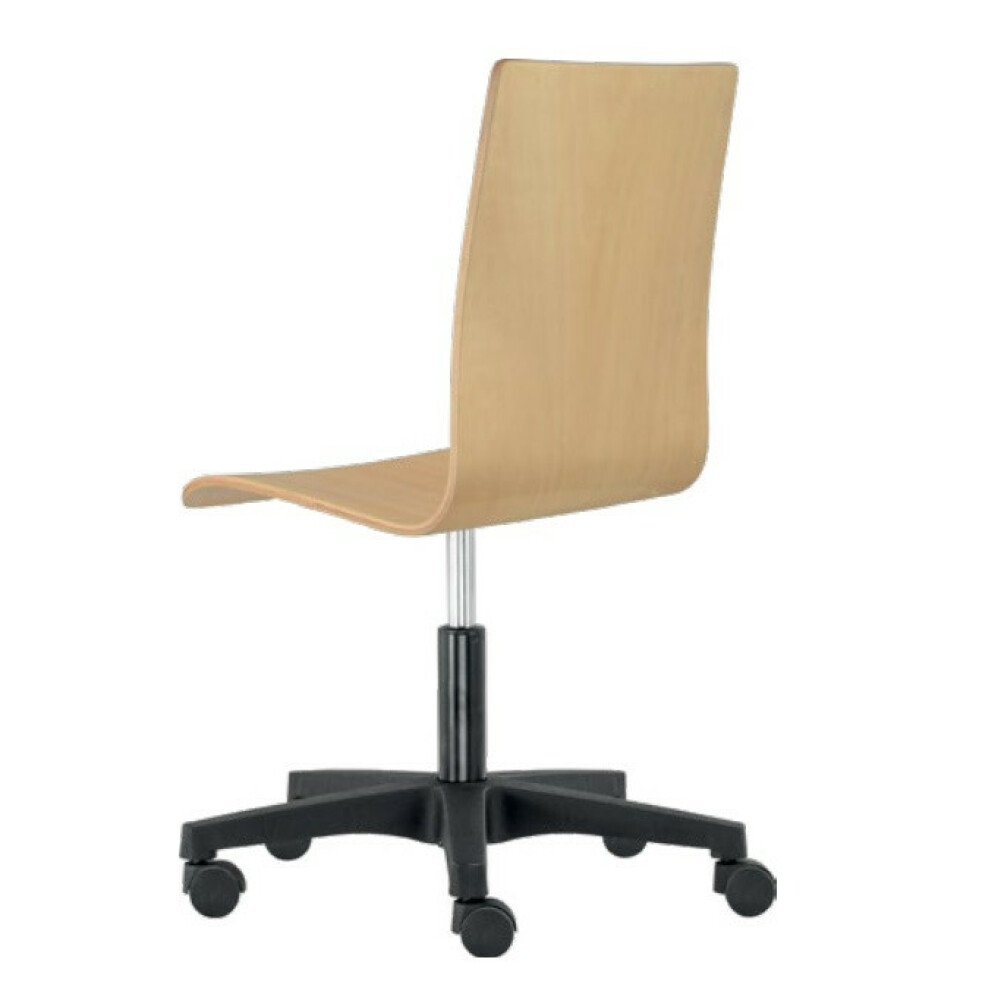 LILLY - otočná židle na pětiramenném kříži s kolečky. Sedák a opěrák je vyroben z lisované bukové dýhy v přírodním provedení. Za příplatek můžete vybrat židli v barevném moření, popř. v provedení lamimát, kde je velký výběr odstínů a barev. Tyto příplatkové varianty jsou možné od 50 ks a jsou na poptávku. Kříž otočné židle má v základním provedení pětiramenný černý s kolečky, za příplatek je i v jiném provedení. Židle je vhodná jako studentská, konferenční jednací či tam, kde není dostatek místa.