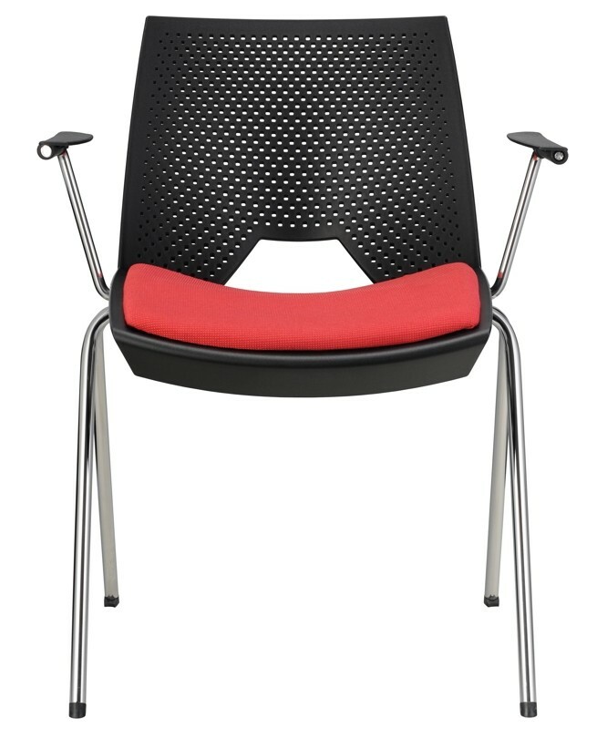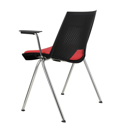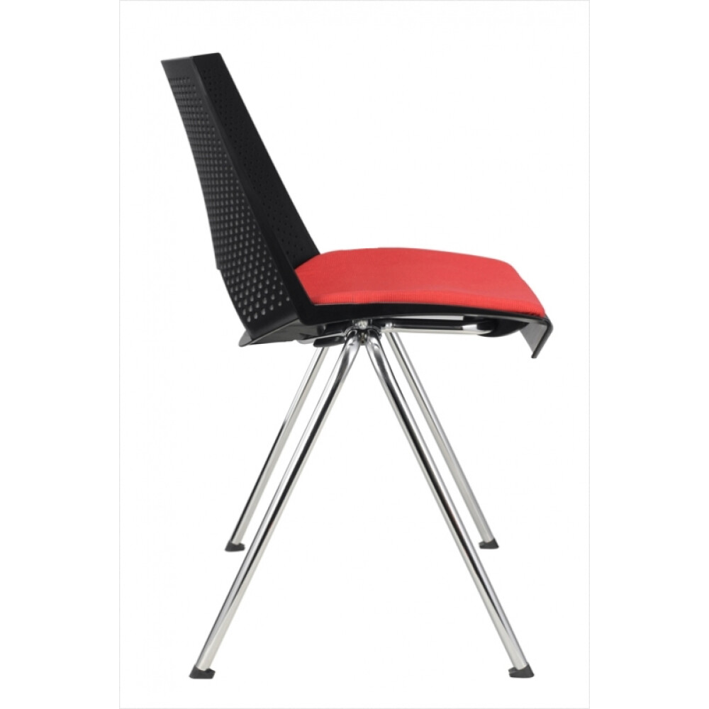 Praktická a univerzální plastová židle vhodná do jídelen nebo školicích místností. Konferenční židle má plastový sedák kombinovaný s čalouněním. Plastový opěrák zaujme svým perforováním. Kostru tvoří chromová čtyřnohá konstrukce do tvaru písmene A. Židle je typická hranatým otvorem mezi sedákem a opěrákem. Volitelným doplňkem jsou područky, případně područky se sklápěcím stolkem. Stolek je možné umístit na levou či pravou stranu - specifikaci je nutno uvést v objednávce.